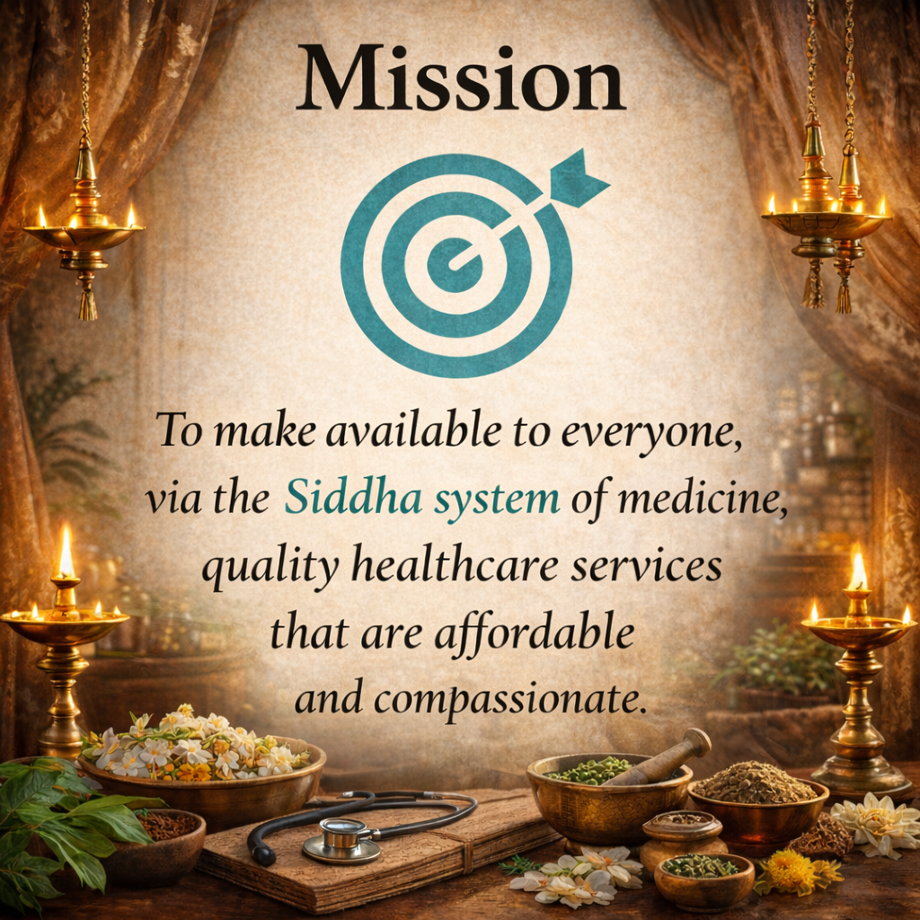 Siddha 365 Health Care என்பது பழமையான மற்றும் அறிவியல் அடிப்படையிலான சித்த மருத்துவ முறையை பின்பற்றி செயல்படும் ஒரு நம்பகமான சித்த மருத்துவமனை ஆகும். உடல், மனம் மற்றும் ஆன்மா ஆகிய மூன்றையும் சமநிலைப்படுத்தி, நோயின் மூல காரணத்தைச் சிகிச்சை செய்வதே எங்கள் முதன்மை நோக்கமாகும்.தகுதி பெற்ற மற்றும் அனுபவமிக்க சித்த மருத்துவரின் வழிகாட்டுதலின் கீழ், உண்மையான மூலிகை மருந்துகள், பாரம்பரிய நோய் கண்டறிதல் முறைகள் மற்றும் இயற்கை சிகிச்சைகள் வழங்கப்படுகின்றன. சித்த மருத்துவத்தின் அடிப்படை கோட்பாடுகளான ஒழுக்கம், வாழ்க்கை முறை ஒத்திசைவு மற்றும் நோய் தடுப்பு பராமரிப்புக்கு இங்கு முக்கியத்துவம் அளிக்கப்படுகிறது.